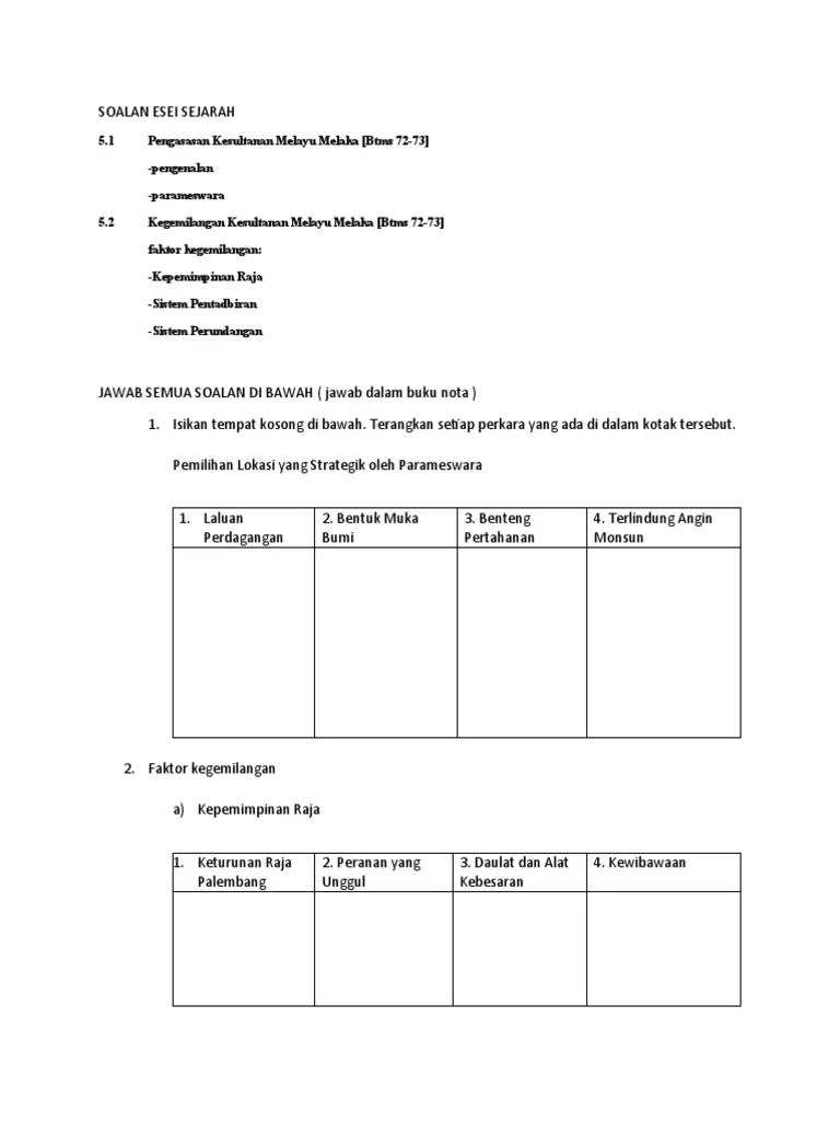 Jawab semua soalan di bawah ( jawab dalam buku nota ). Contoh menulis jawapan esei sejarah spm soalan: Soalan esei sejarah ting 2 bab 5 1. Bab 5 kesultanan melayu melaka : Parameswara melarikan diri dari palembang setelah terlibat dalam peperangan dengan kerajaan majapahit.